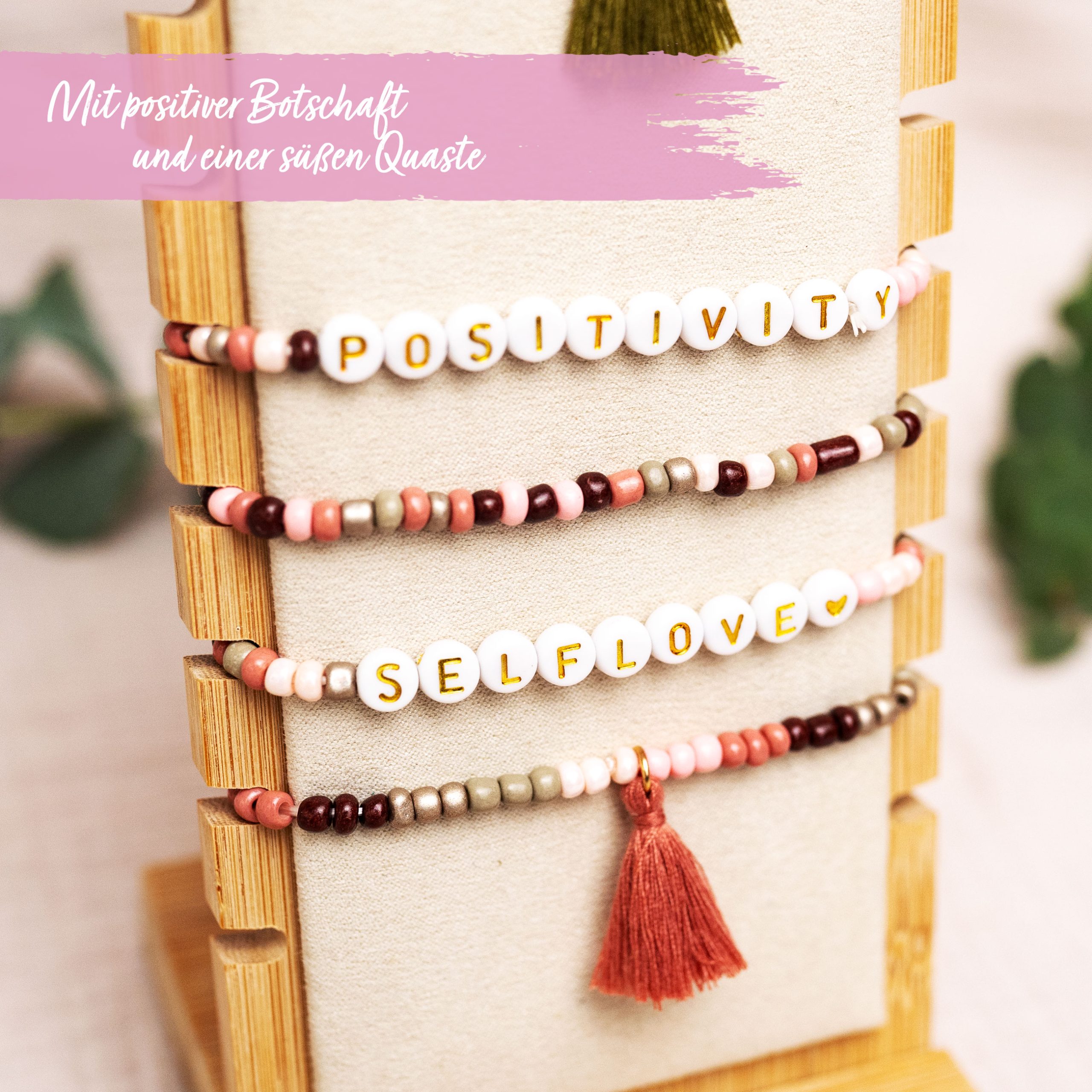 KOMPLETTSET: In diesem Set enthalten sind vier Perlenarmbänder. Zwei davon sind mit inspirierenden Sprüchen – POSITIVITY und SELFLOVE versehen, eines ziert ein charmanter Quaste-Anhänger, und das vierte ist ein schlichtes Perlenarmband. Dieses Ensemble ist perfekt zum Verschenken geeignet und ideal, um Freude zu bereiten.