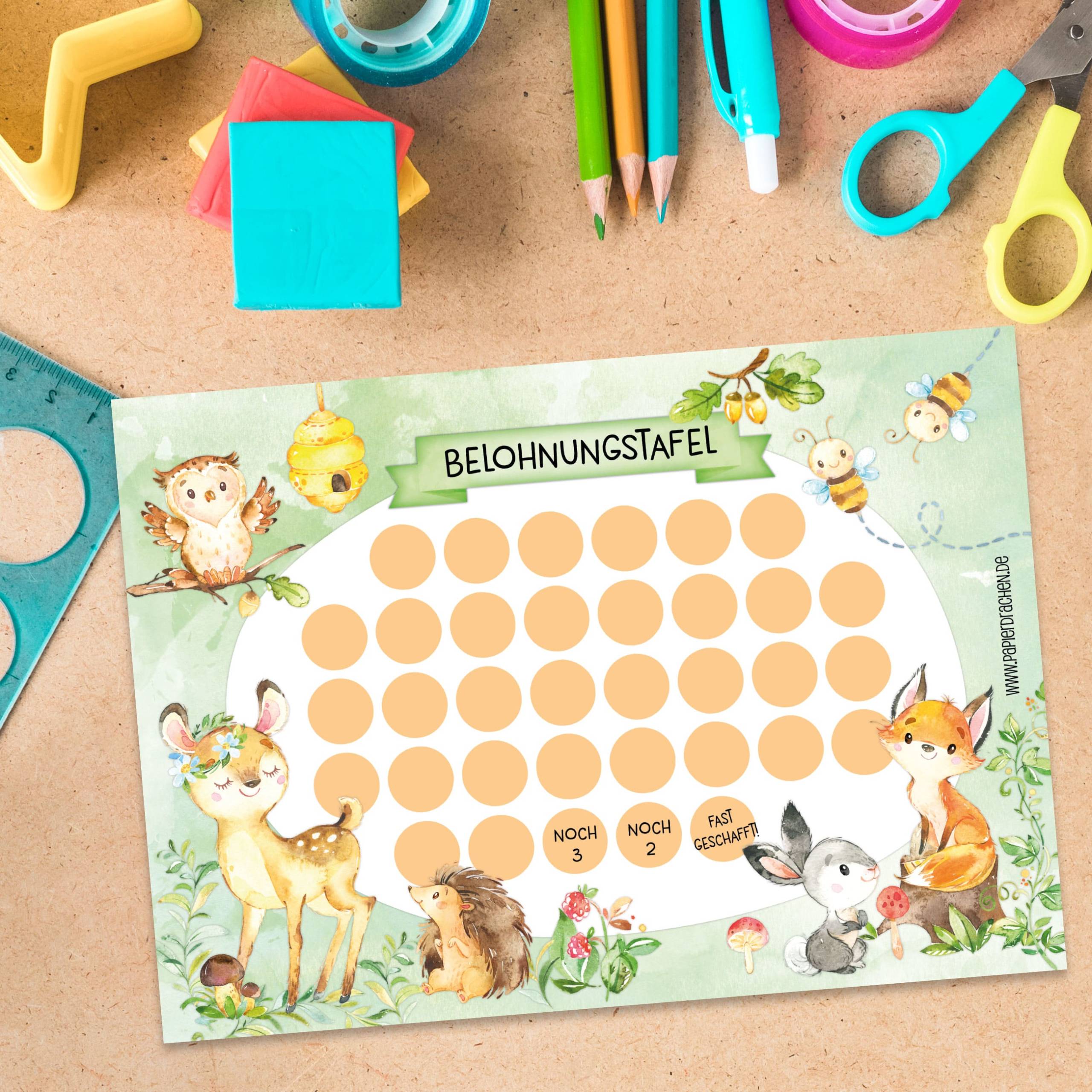 Belohnungstafel für Kinder 10 Blatt – mit tollen Stickern für Jungs und Mädchen – Motiv Waldtiere