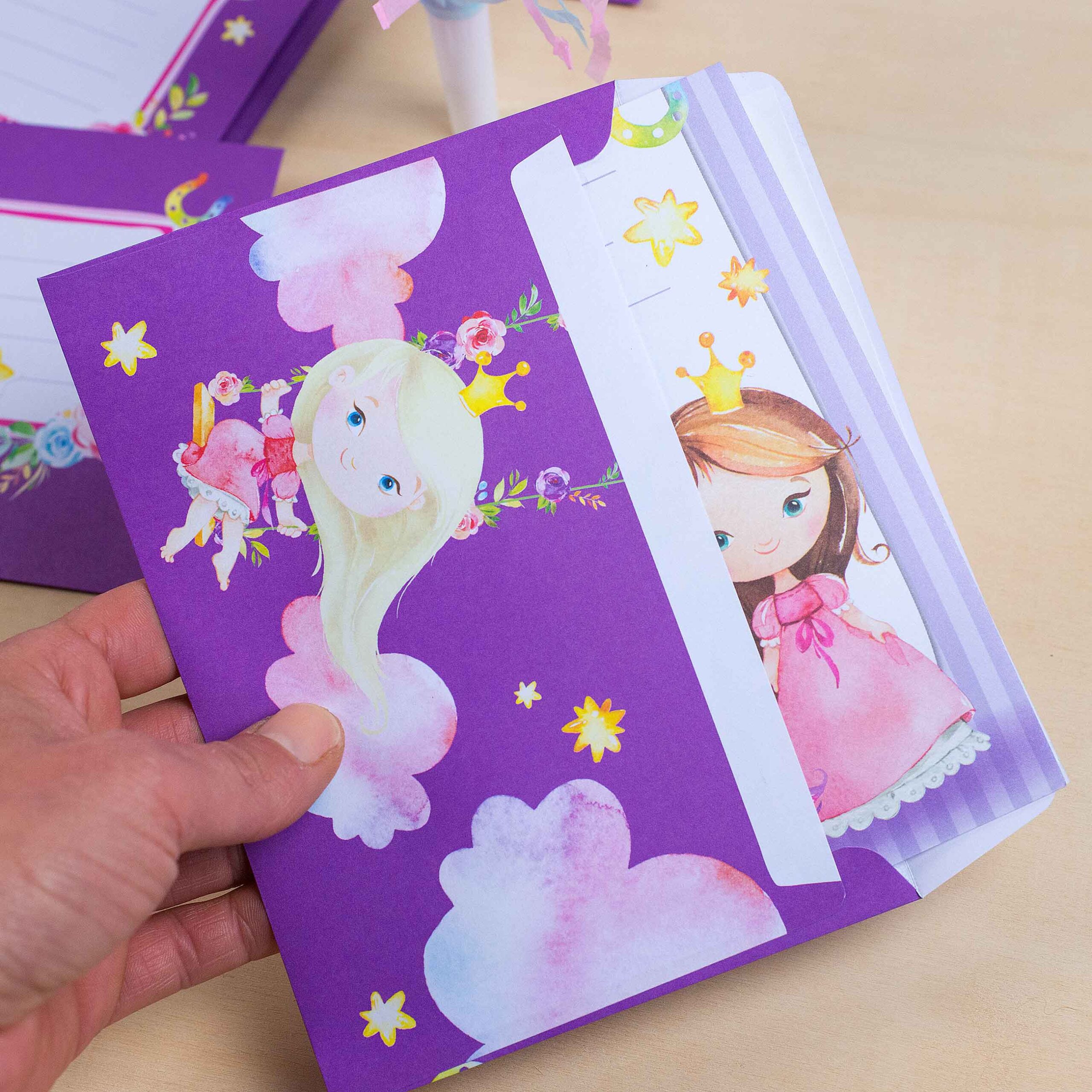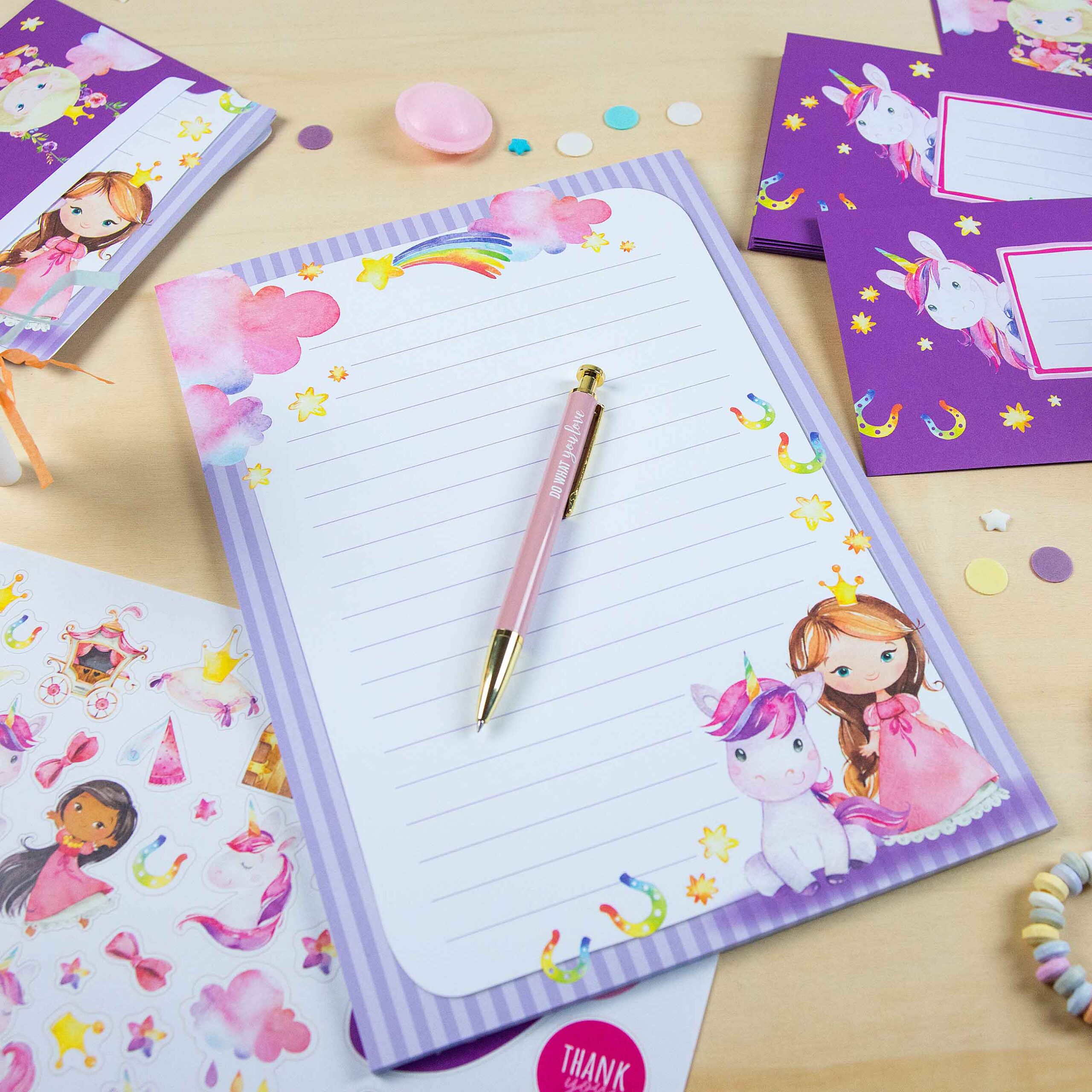 Papierdrachen Briefblock Set – 50 bunt bedruckte Briefbögen – Briefpapier mit Stickerbogen – 20 bedruckte Umschläge – Geschenkidee für Kinder – Einhorn