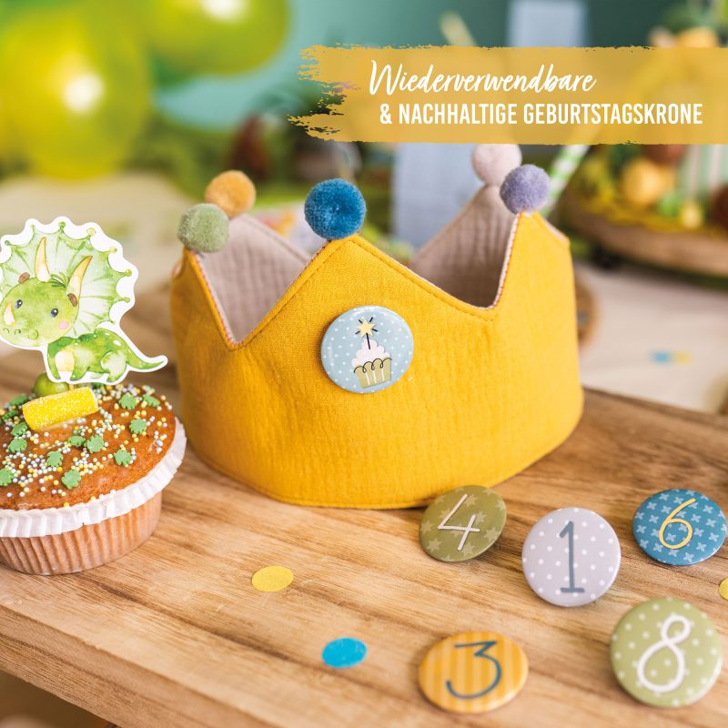 • Komplettset zum Geburtstag: Diese Krone aus Musselin mit niedlichen Bommeln lässt sich jedes Jahr mit der passenden Zahl bestücken – einfach den Button anbringen, fertig! Auch für Geschwisterkinder geeignet
