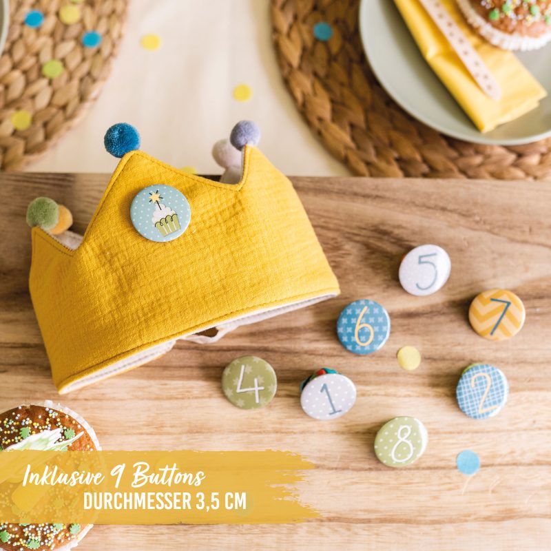 • Inklusive 9 Buttons mit den Zahlen 1-8 – jeder Button hat einen Durchmesser von 35mm. Dazu gibt es einen Button mit einem Geburtstagstörtchen