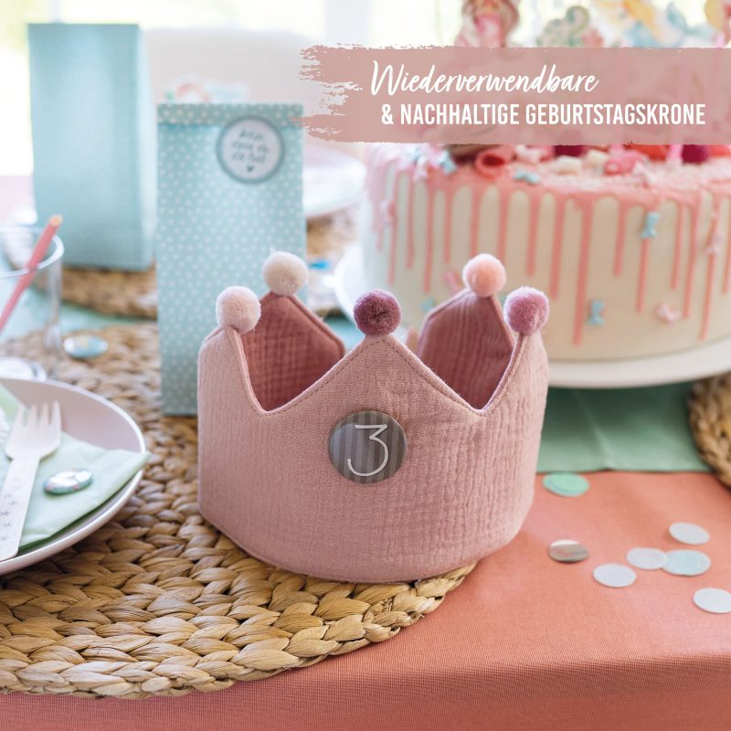 Das ideale Geburtstags Accessoire sollte auf keinem Geburtstag fehlen. Dein Kind wird sich über den angenehmen und modernen Musselinstoff freuen, denn dieser ist sehr leicht und passt sich wunderbar der Kopfform an. Ausserdem kannst du die Krone mit dem Band individuell binden. Die Geburtstagskrone ist 40cm lang x 11cm hoch, dazu befinden sich auf den Spitzen süsse Bommel. Die Buttons mit einem Durchmesser von 35 mm können bis zu dem achten Geburtstag ausgetauscht werden. So kaufst du auch ein Produkt, dass langlebig und ressourcenschonend ist, zudem schont es auch deinen Geldbeutel. Die Krone ist in verschiedenen Farben erhältlich, auch aus Samtstoff.