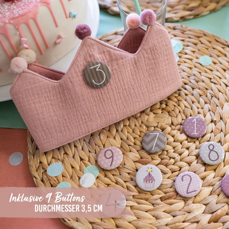 • Inklusive 9 Buttons mit den Zahlen 1-8 – jeder Button hat einen Durchmesser von 35mm. Dazu gibt es einen Button mit einem Geburtstagstörtchen
