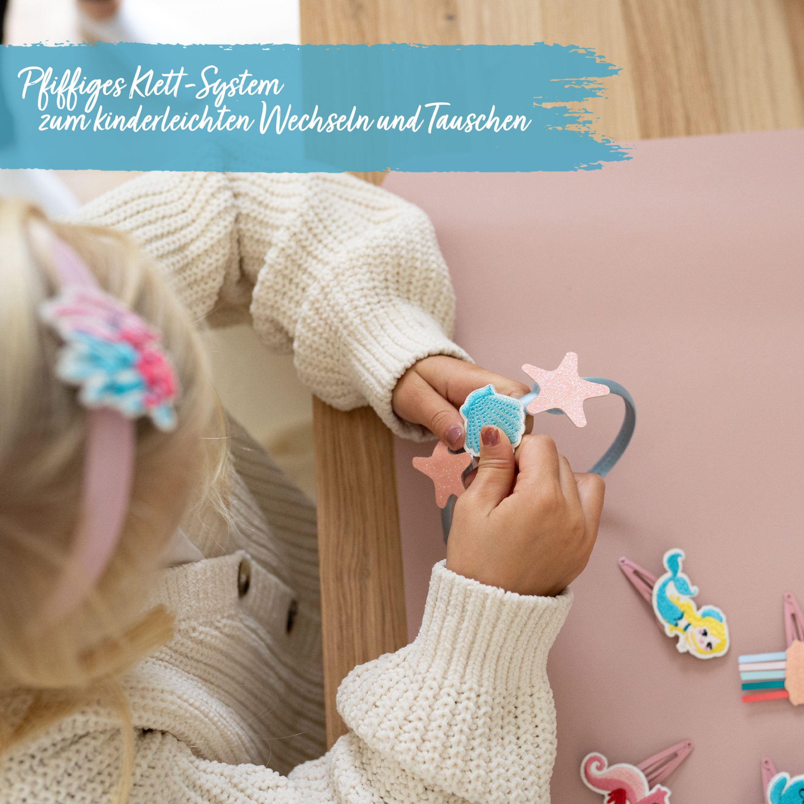 Variabler Stil mit Patches: Unser Set bringt die Kreativität auf ein neues Level! Jedes Haar-Accessoire, sei es der Haarreifen, die Haarclips oder das Haarband, ist mit einem Klettpunkt ausgestattet. Die 8 mitgelieferten Patches können nach Lust und Laune angebracht werden, sodass jedes Accessoire individuell gestaltet werden kann.