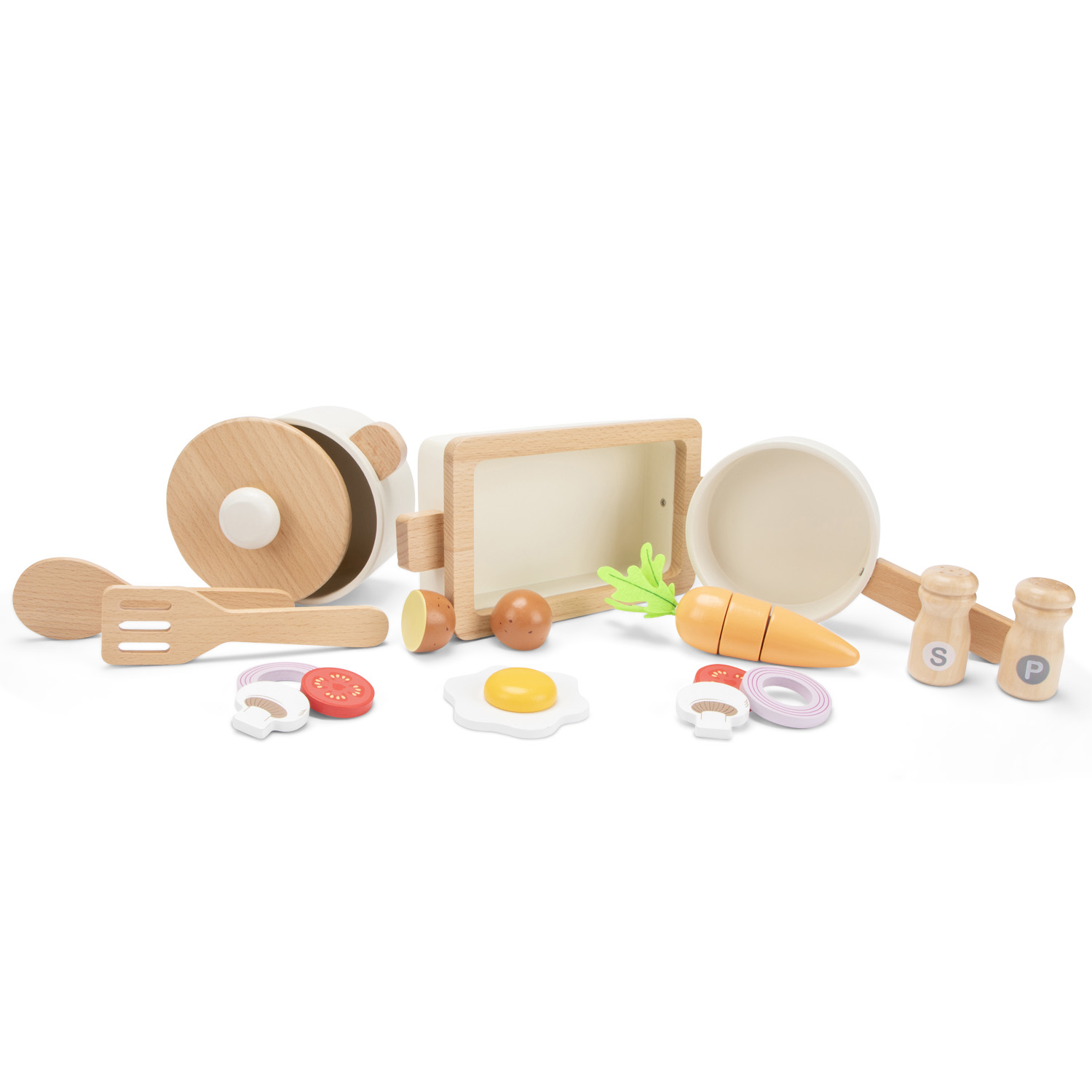 Das Set enthält einen Kochtopf mit Deckel, eine Bratpfanne mit Ei, einen Eintopf mit zwei Holzutensilien, eine schneidbare Karotte und eine Gemüsemischung mit Tomaten, Zwiebeln und Pilzen. Salz- und Pfefferstreuer runden das Set ab. Kinder können Zutaten kombinieren, eigene Rezepte ausdenken und Mahlzeiten für Freunde, Spielzeuge oder Familienmitglieder zubereiten. Beim Spielen trainieren sie ganz natürlich ihre Feinmotorik, Kreativität und soziale Interaktion. Die perfekte Ergänzung für jede Spielküche – Bon Appetit!