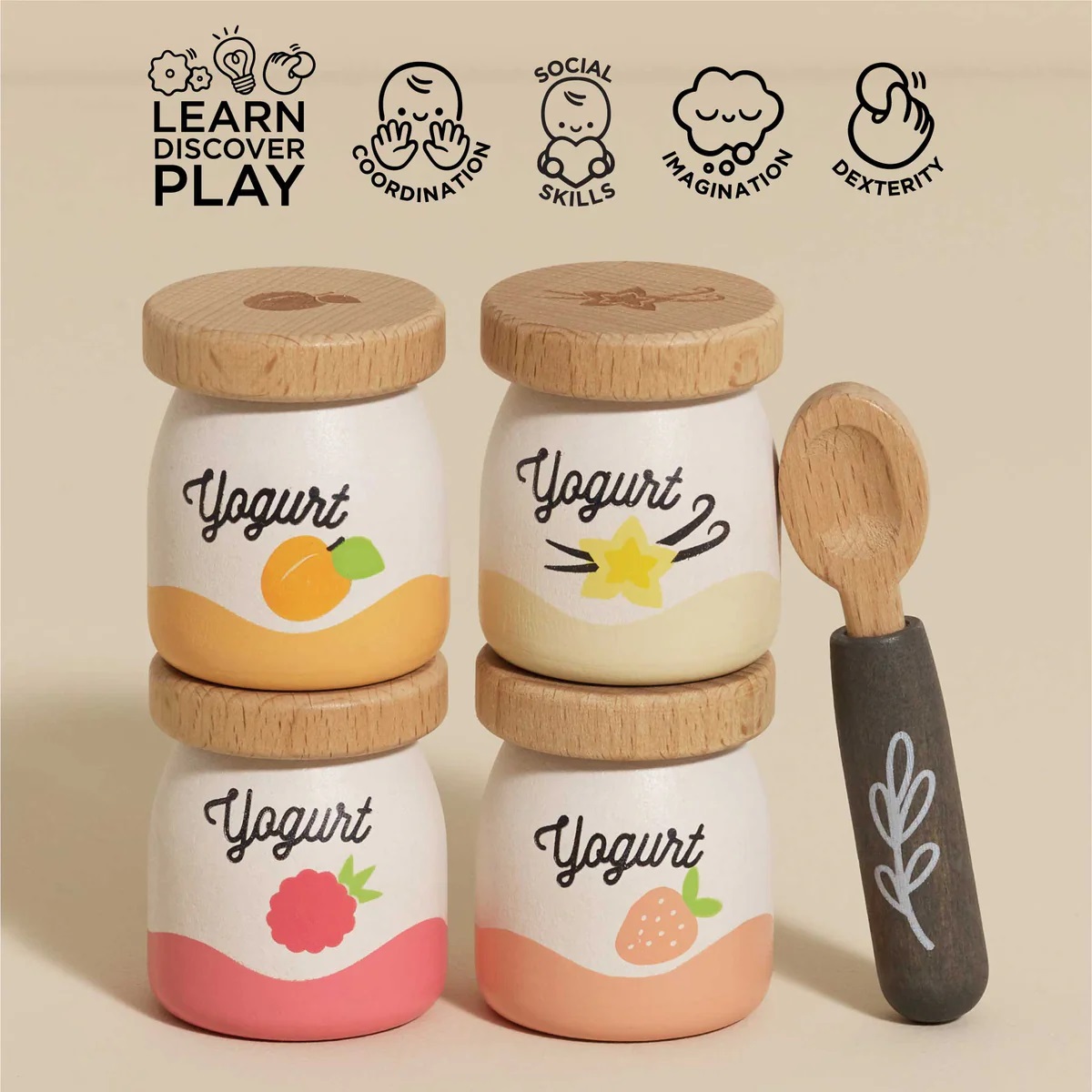 Der Deckel jedes Topfes ist aus Naturholz und mit kunstvollen Details graviert, die der Fantasie Ihres Kindes einen Hauch von Realismus verleihen. Zusammen mit dem passenden Löffel fördert dieses Set das interaktive Rollenspiel und ermöglicht es Ihrem kleinen Koch, nach Herzenslust imaginäre Joghurts zu servieren.