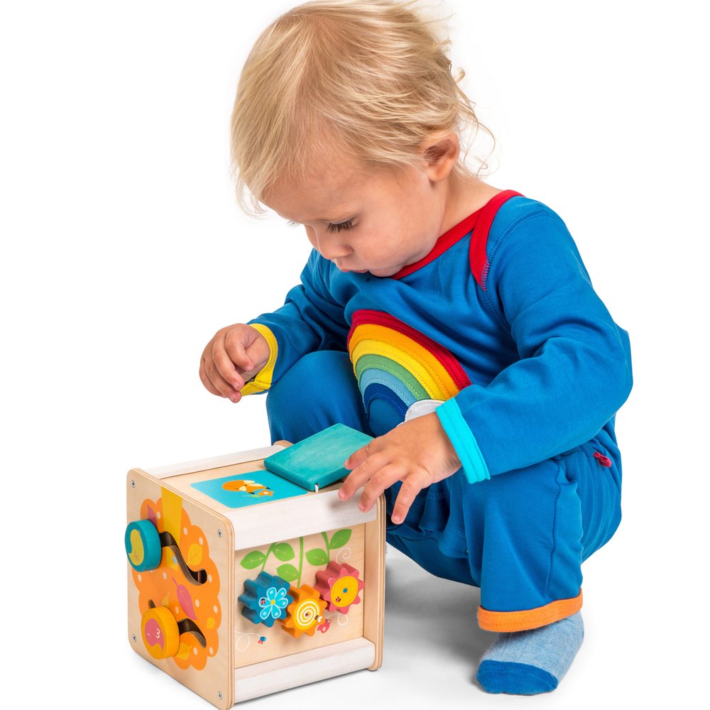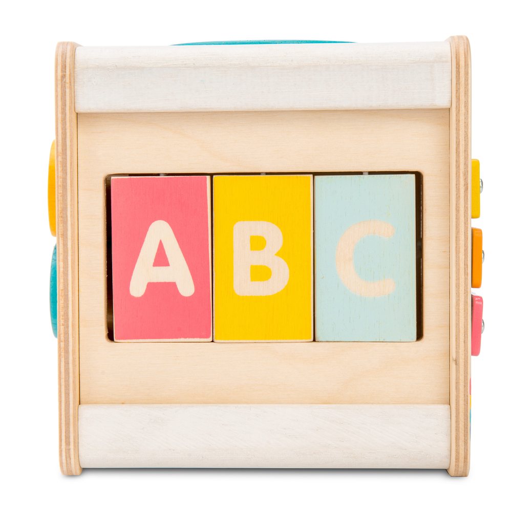 Ein multifunktionaler, kompakter Holzwürfel, schönes und komplettes kleines Holz-Aktivitätszentrum für Kleinkinder.