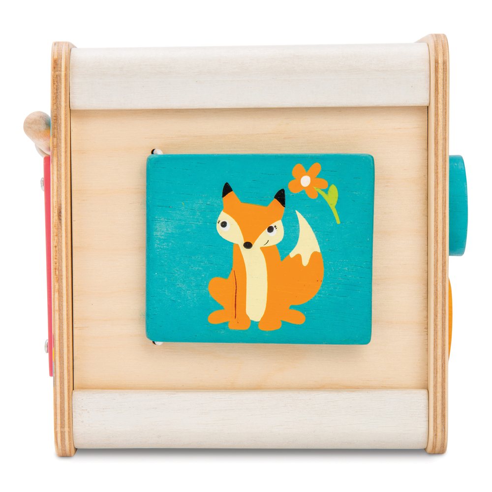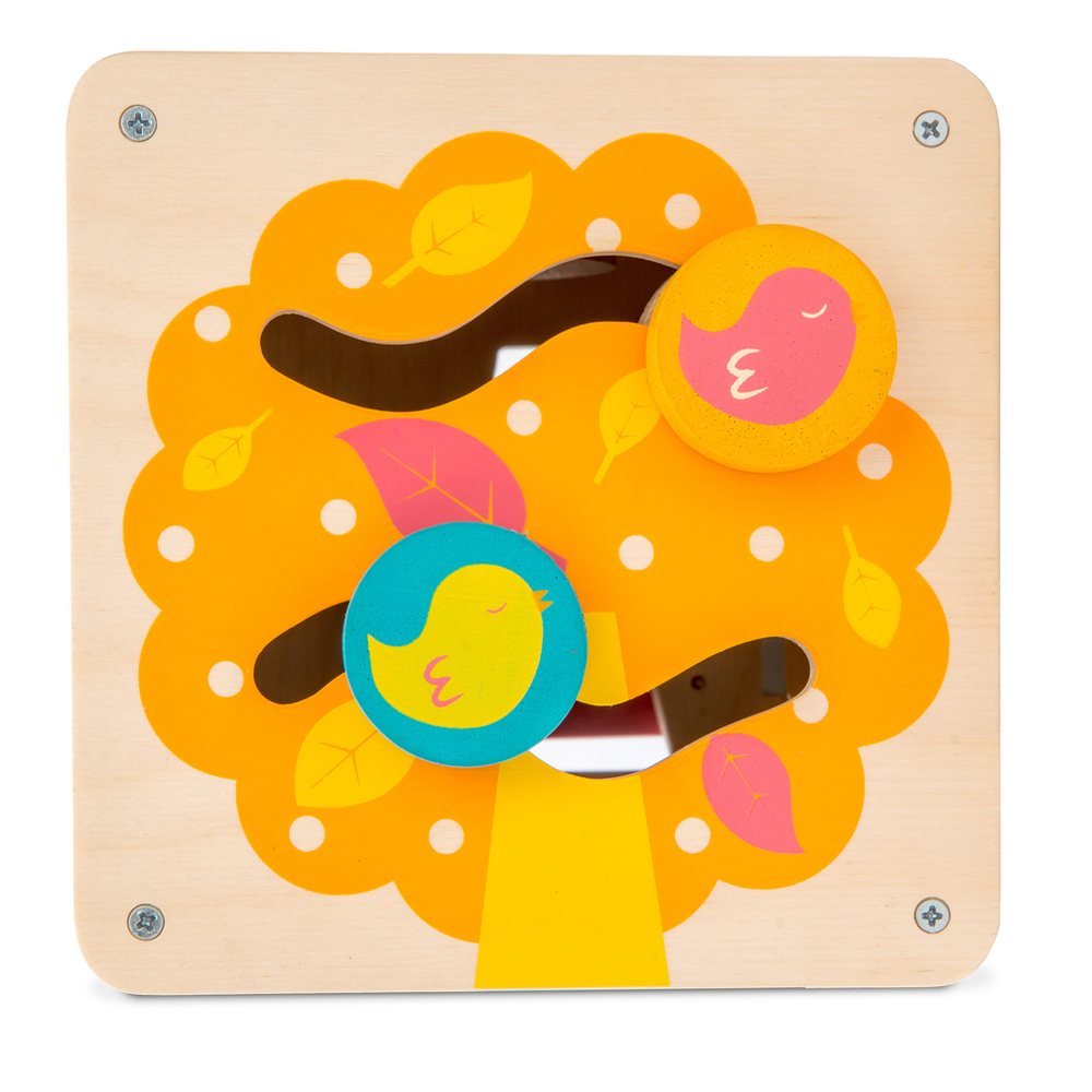 Zu den Aktivitäten gehören: Tür zum Öffnen, Spinnrad, ABC-123 Türen, ein Xylophon, drei Zahnräder mit einem schwächeren Motiv zum Drehen und zwei Vögel, die über einen Herbstbaum gleiten.