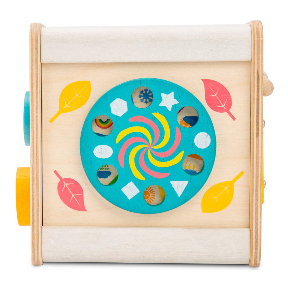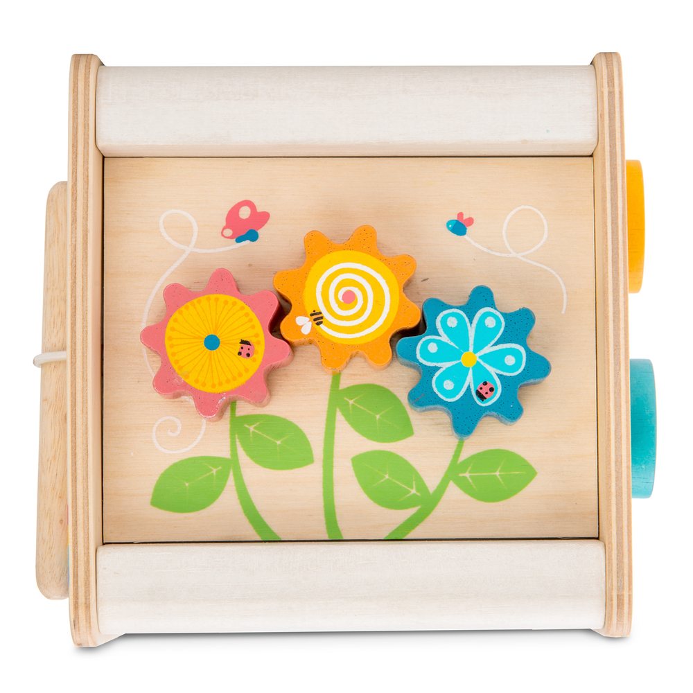 Ein multifunktionaler, kompakter Holzwürfel, schönes und komplettes kleines Holz-Aktivitätszentrum für Kleinkinder. Zu den Aktivitäten gehören: Tür zum Öffnen, Spinnrad, ABC-123 Türen, ein Xylophon, drei Zahnräder mit einem schwächeren Motiv zum Drehen und zwei Vögel, die über einen...
