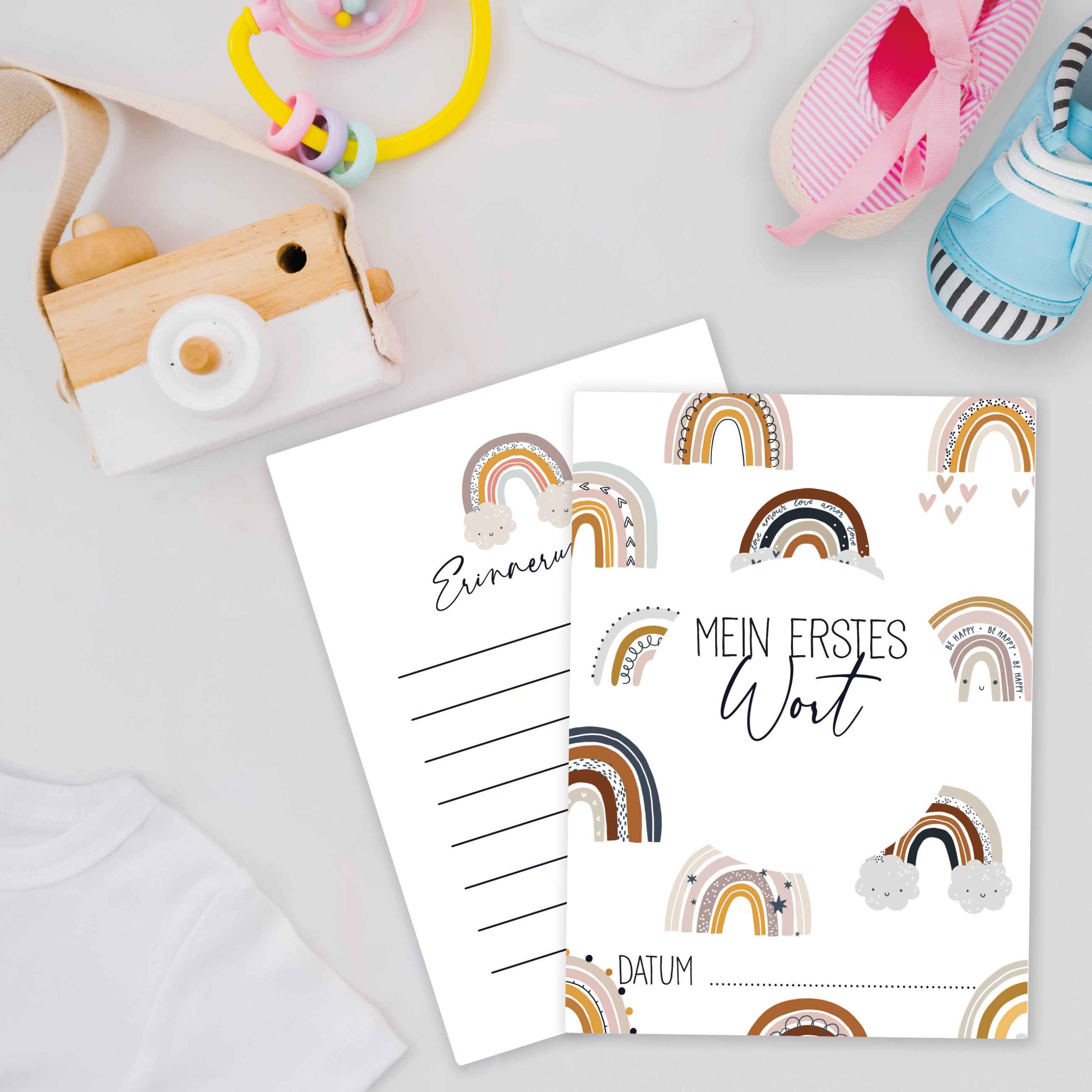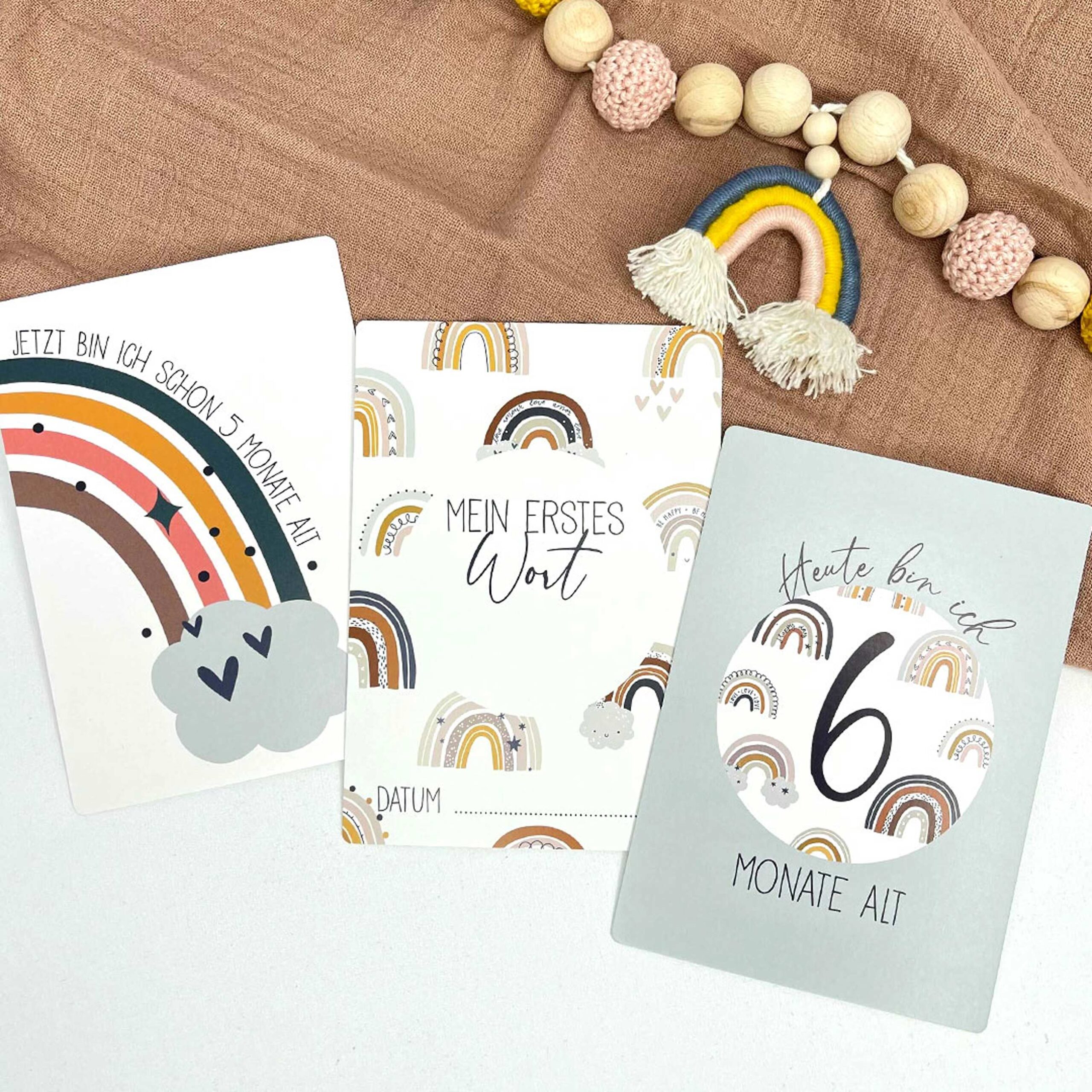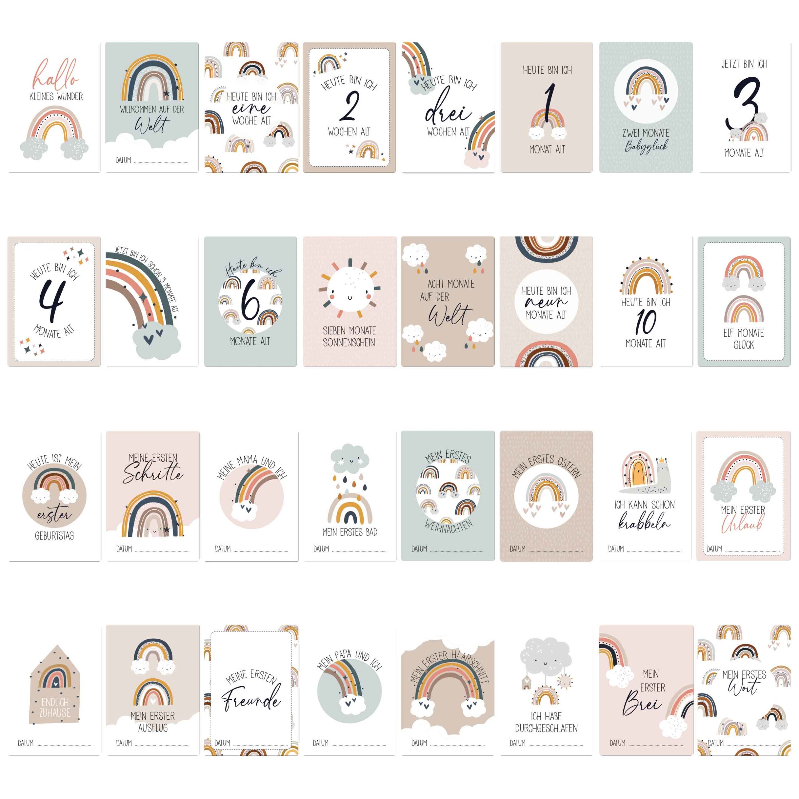 Jede Karte ist hochwertig bedruckt und hat abgerundete Ecken, sodass das Kind sich nicht verletzen kann. 32 süsse Meilensteinkarten Die niedlichen Meilensteinkarten sind kindgerecht mit Regenbögen bedruckt und eignen sich für Mädchen und Jungen gleichermassen.