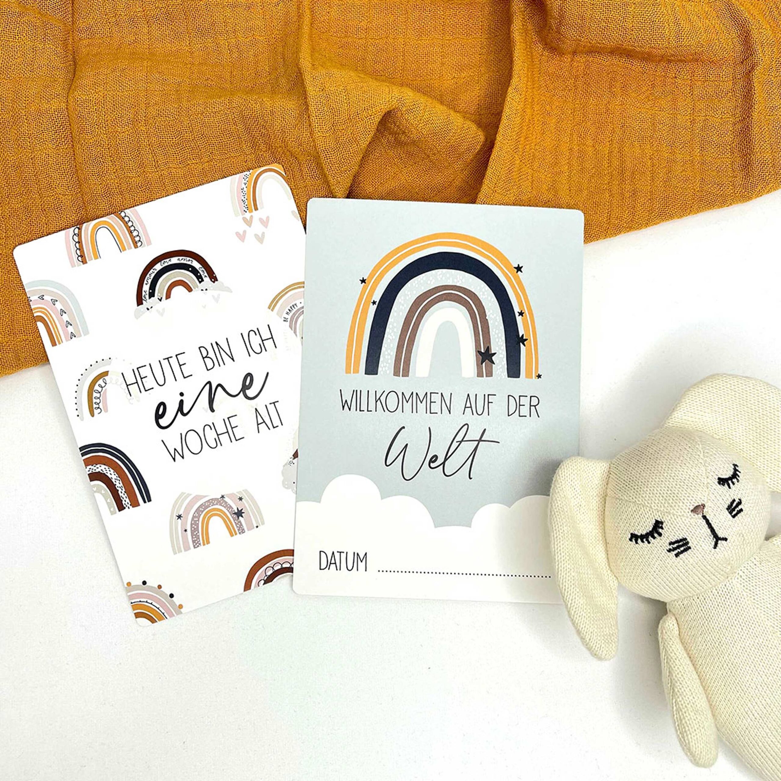 Für die ersten 3 Wochen gibt es jeweils eine Karte sowie für die Monate 1-11 bis hin zum ersten Geburtstag. Für jeden Meilenstein machst du ein Foto von deinem Baby mit der jeweiligen Karte und schaffst so eine Grundlage für wundervolle Erinnerungen.