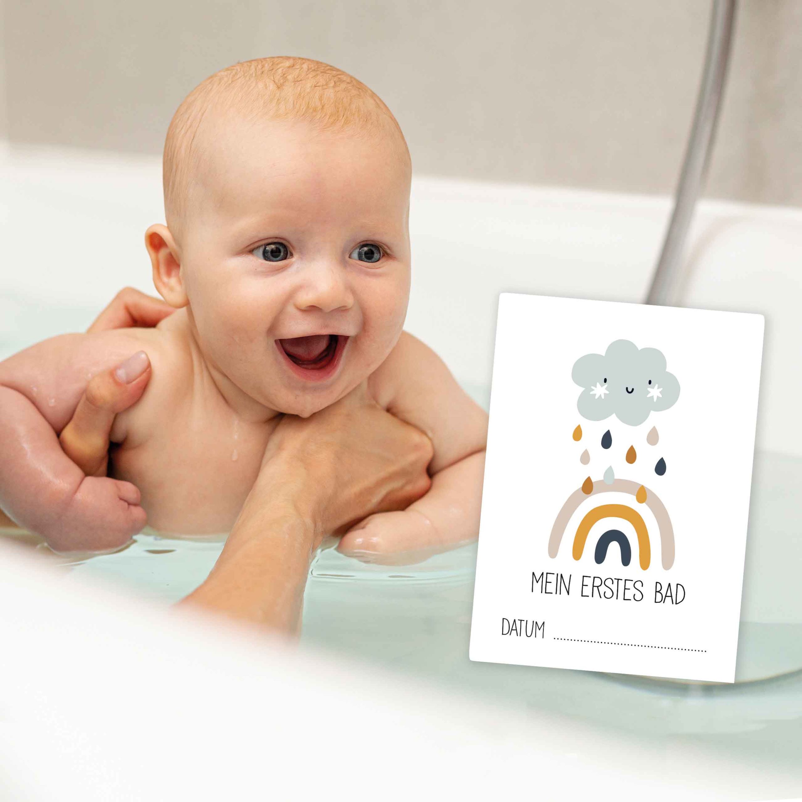 Mit wichtigen Meilensteinen wie: „Ich habe heute durchgeschlafen“, „Mein erster Urlaub“ und „Mein erstes Bad“ gestaltest du eine tolle Grundlage für euer Fotoalbum oder ein Fotobuch für Babys erstes Jahr.