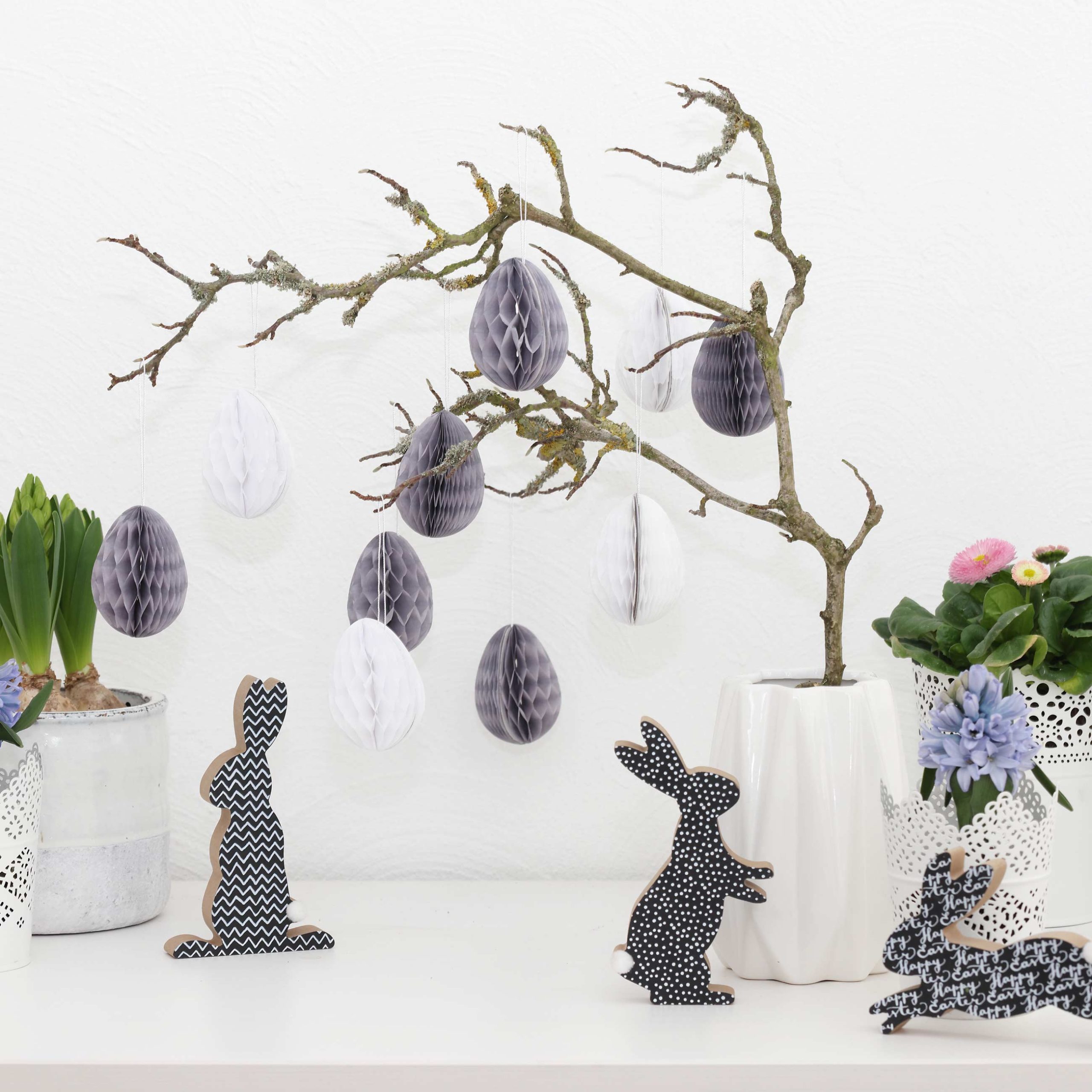 Ostereier zum Hängen sind eine klassische, moderne Frühlingsdekoration und können vielseitig eingesetzt werden. In der Wohnung können Sie damit zum Beispiel Sträucher und Zweige wunderbar verschönern.