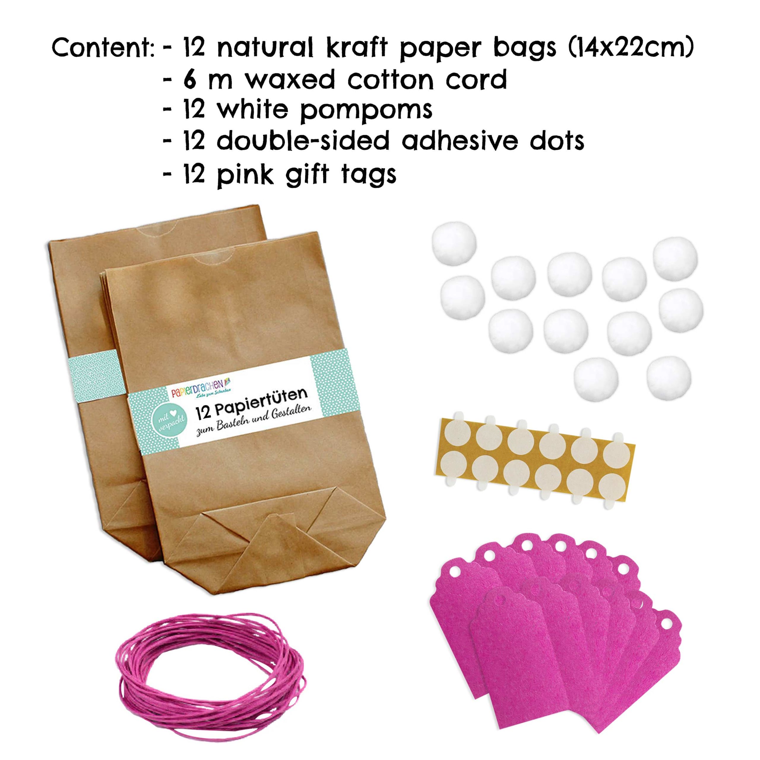 – 12 Geschenktüten aus Kraftpapier (Kreuzbodenbeutel) der Grösse 22 x 14 cm (Höhe x Breite, ungefaltet)