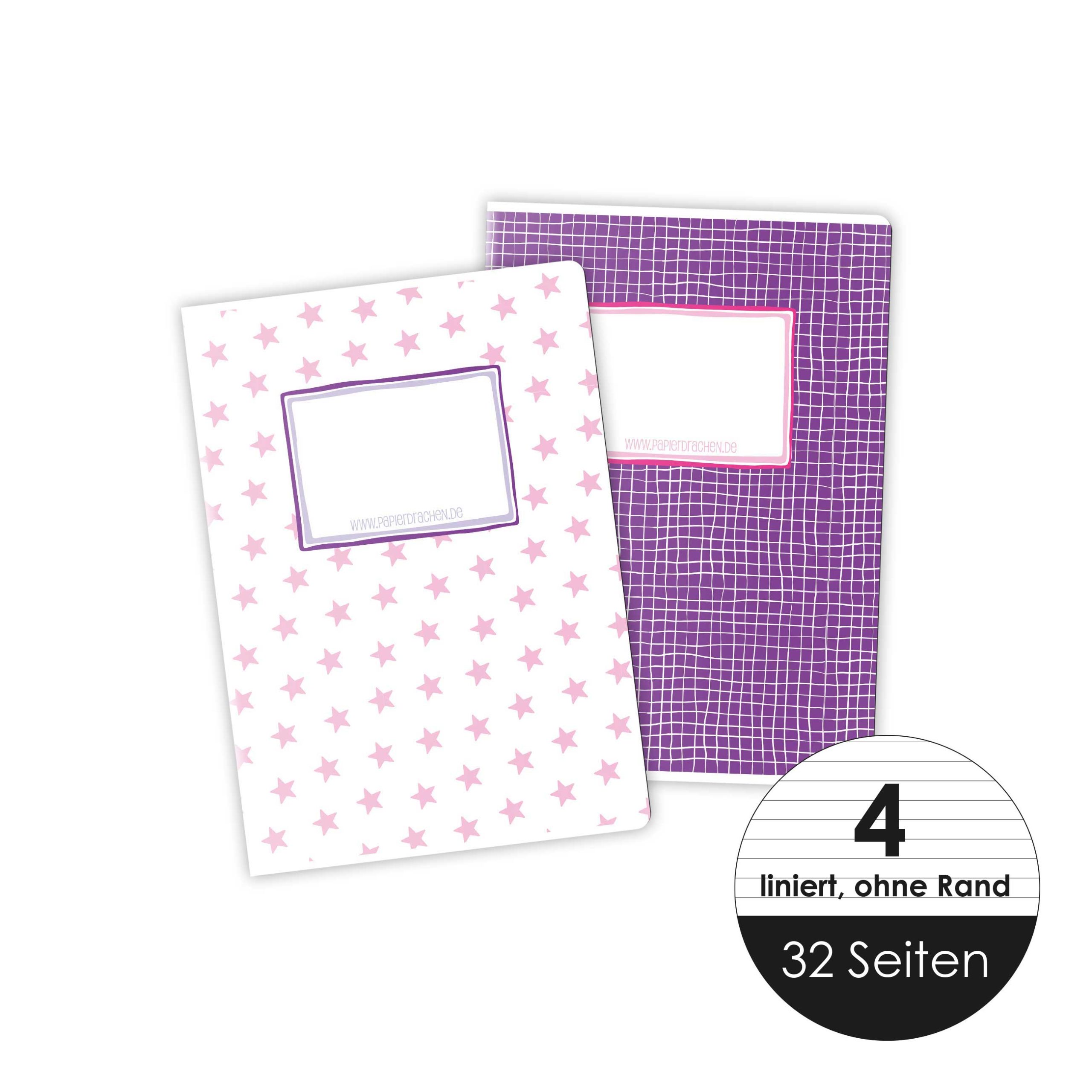 Du erhältst in dem Set vier Schulhefte im DIN A5 Format (14,8 cm x 21,0 cm) mit Beschriftungslinien auf der Vorderseite und 16 Blatt / 32 beschreibbaren Seiten aus 70 g/m² starkem Papier.