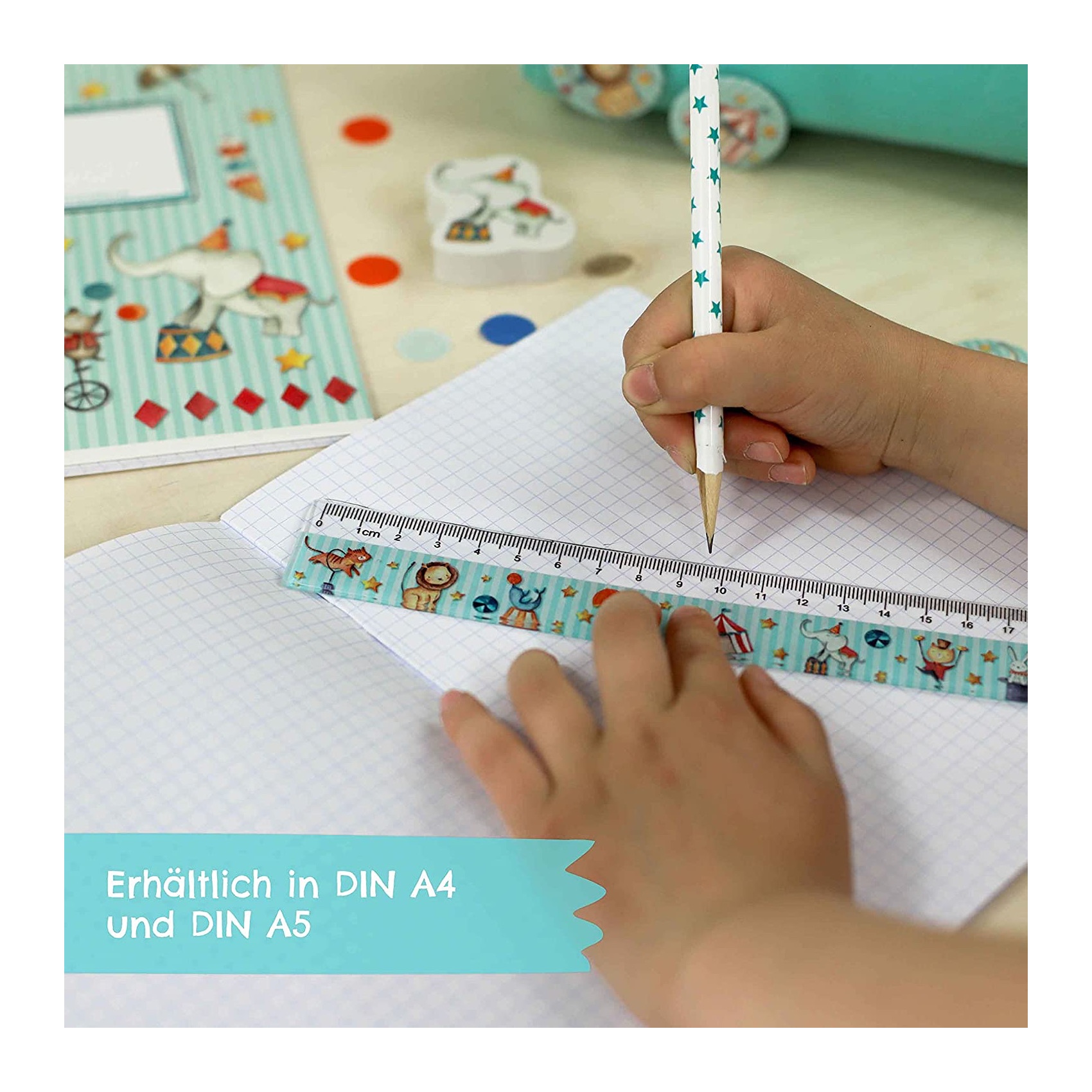 4 hochwertige Schulhefte für Kinder DIN A5 | liniert und kariert 32 Seiten – Motiv Zirkus– zur Einschulung für Grundschüler – 32 Blatt Mit diesem Set sind deine Kinder rundum ausgestattet für die Schule – es sind linierte und karierte Hefte enthalten, so können die Hefte für alle Fächer benutzt werden. Die Zeit von monotonen Schulheften ist vorbei. Unsere Hefte sind mit liebevollen und kindgerechten Zirkus-Motiven bedruckt. Sie bringen garantiert Farbe und Freude in den Schulalltag deiner Kinder. Du erhältst in dem Set vier Schulhefte im DIN A5 Format (14,8 cm x 21,0 cm) mit Beschriftungslinien auf der Vorderseite und 32 Blatt / 32 beschreibbaren Seiten aus 70 g/m² starkem Papier. Die linierten Hefte haben einen Zeilenabstand von 10mm und Lineatur 4 – ohne Rand. Die karierten Hefte haben einen Zeilenabstand von 5mm und Lineatur 5 – ohne Rand. Verschiedene Motive sind erhältlich – für jeden ist etwas dabei. Wir bieten außerdem unsere Schulprodukte wie Hefte, Mäppchen, Schreibsets und Sammelmappen in aufeinander abgestimmten Designs an – so kannst du das passende Zubehör zu den Heften holen. Lieferumfang: 4 Schulhefte: 2 liniert (Lineatur 4) und 2 kariert (Lineatur 5) DIN A5 | ohne Seitenrand – Motiv Zirkus