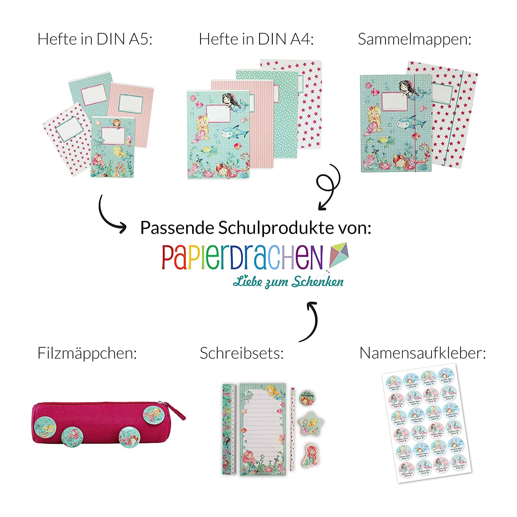 Die Zeit von monotonem Schulzubehör ist vorbei. Unsere Mappen sind mit liebevollen und kindgerechten Meerjungfrau-Motiven bedruckt. Sie bringen garantiert Farbe und Freude in den Schulalltag deiner Kinder.