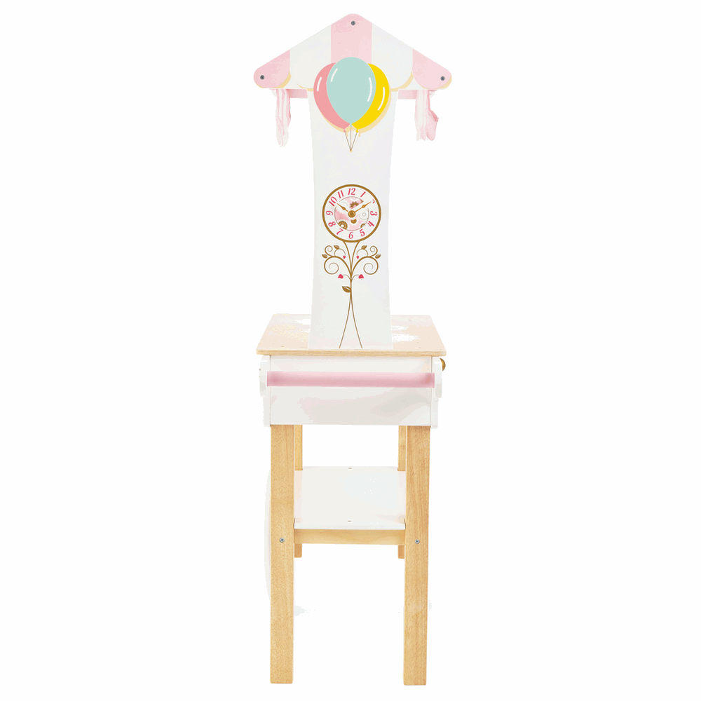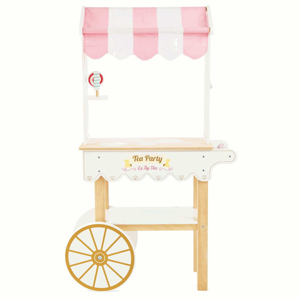 Zeit für Tee! Eingehüllt in ein rosé-weiß gestreiftes Stoffdach und mit einer geheimen Schublade. Ein klassischer Karrenwagen mit zwei Rädern und Griff. Einzigartige Kunstwerke schmücken den Trolley, darunter herrlich illustrierte Getränke- und Kuchenmenüs auf beiden Seiten. Eine goldene Farbe verleiht dem Nachmittagstee den richtigen Stil. Passend zur preisgekrönten Honeybake-Kollektion von LE TOY VAN (separat erhältliche Artikel).Altersempfehlung: ab 3 JahreAbmessungenB:685mm L:325mm H:1140mm