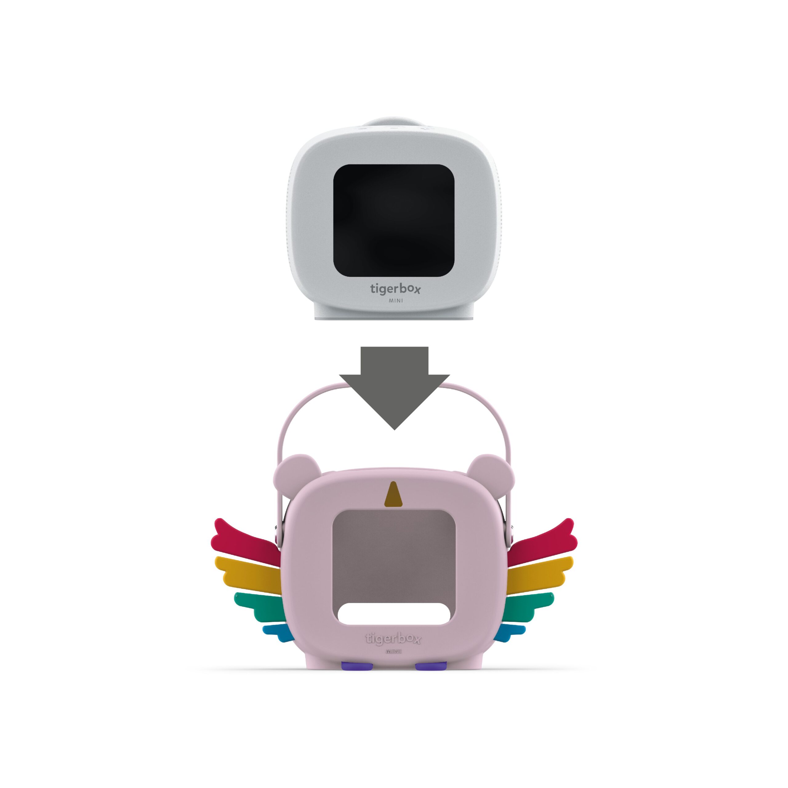 Fünf austauschbare Tragehüllen in Tier- oder Fabelwesenoptik (optional erhältlich) verleihen jeder tigerbox MINI einen unverwechselbaren Charakter und machen sie zum besten Freund. Ein echtes Must-Have für moderne Familien!