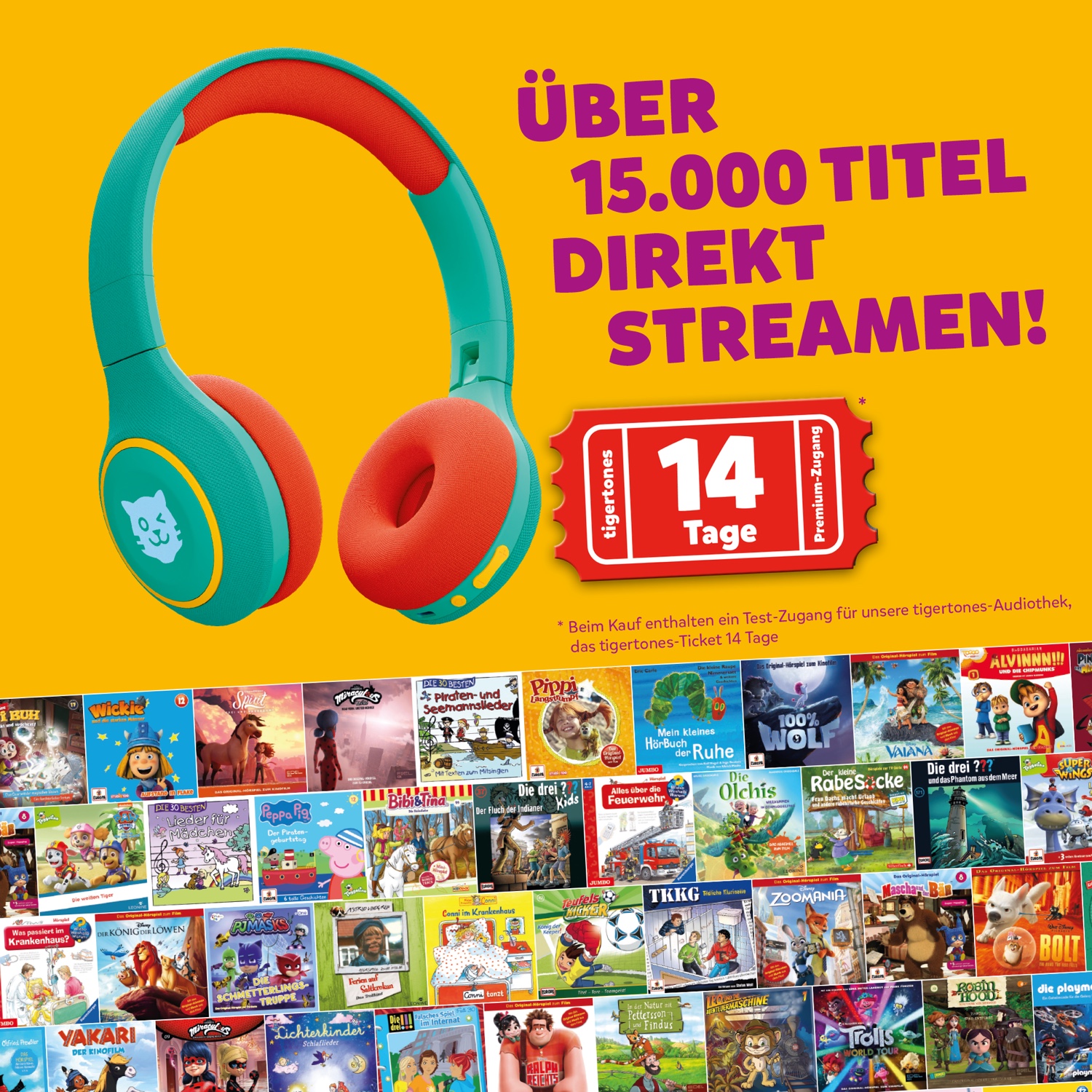 Im Lieferumfang enthalten sind die tigerbuddies, USB-C Ladekabel, USB-C Audiokabel und ein 14-Tage-tigertones Ticket in der exklusiven „Swiss-Edition“ mit Zugang zu über 15.000 Hörspielen, Hörbüchern und Musik für Kinder. Dabei sind Disney Helden, Paw Patrol, Peppa Pig und mehr. Zusätzlich in der „Swiss-Edition“ gibt es hunderte Titel auf schweizerdeutsch wie z.B. Globi, Papa Moll, Pingu, Papagallo & Gollo uvm.