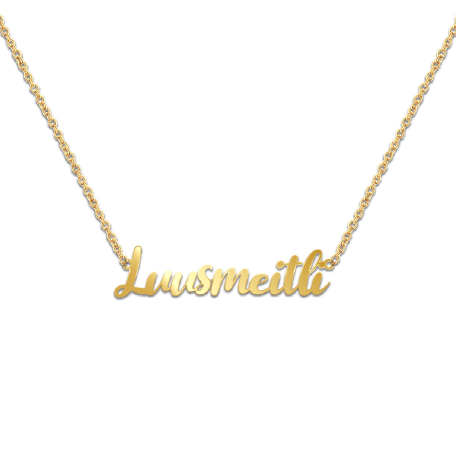 Goldene Anhänger mit „Luusmeitli“, „Cremeschnitte“ und „Schnüggel“ an goldender Halskette. Die Statement Kette mit Wort Anhänger in Schweizerdeutsch. Nur erhätlich von SwissMeme. – Grösse: 4,5 – 6,0 x 1,0 cm – Gewicht: ca. 10 g- Kettenlänge: 36 bis 42 cm- Material: Edelstahl