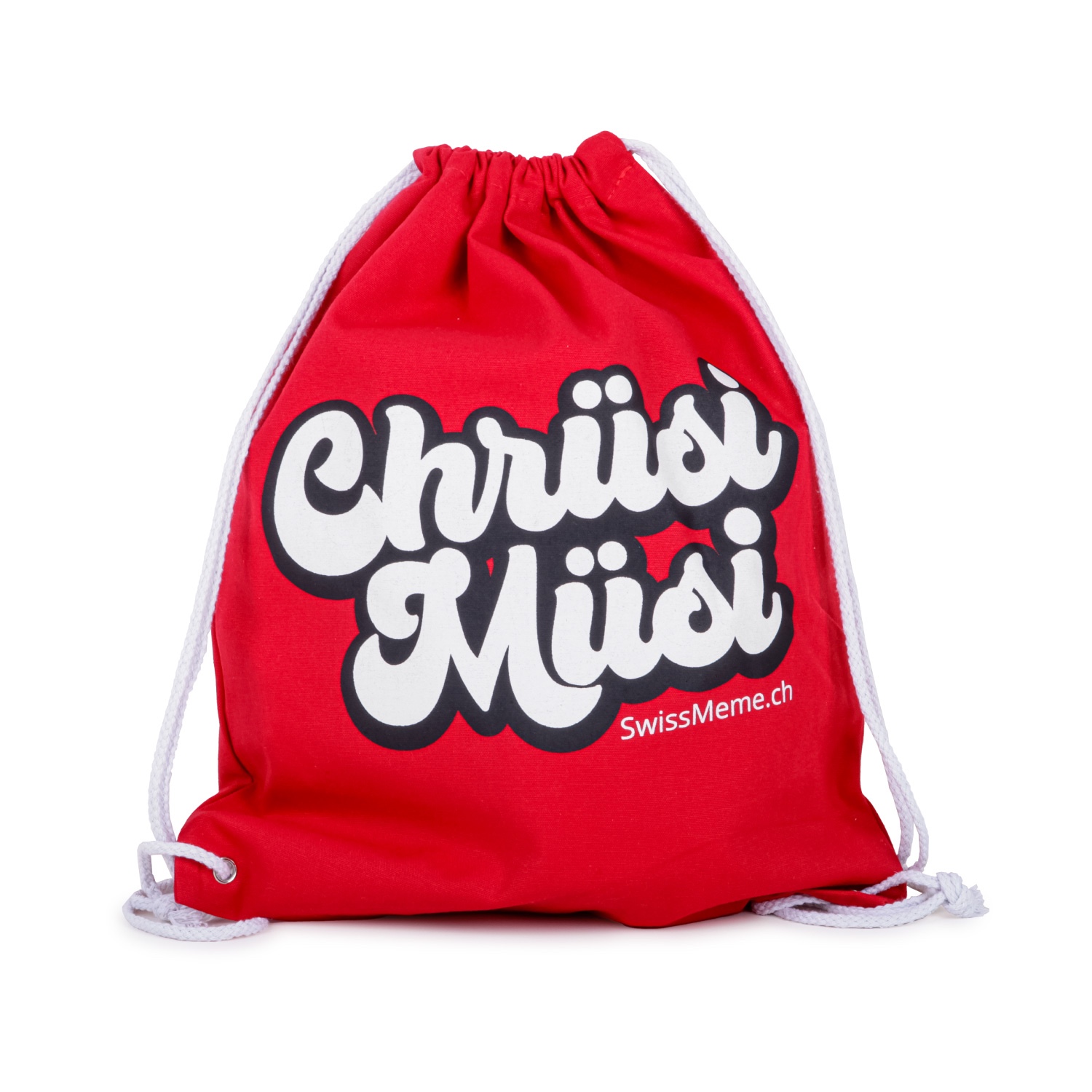 Roter Turnbeutel Rucksack mit dem Aufdruck Chrüsi Müsi. Beidseitig mit hochwertigem Siebdruck bedruckt. Nur erhältlich von SwissMeme. – Grösse: 35 x 42 cm – Gewicht: 150 g- Material: Baumwolle