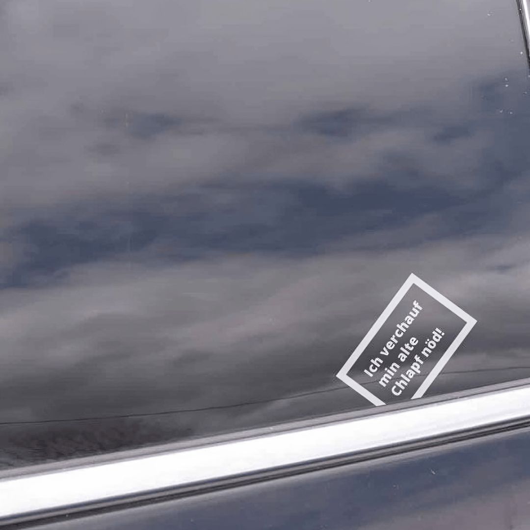Lustiger Aufkleber für die Autoscheibe, damit jeder weiß, dass ich mein Auto nicht verkaufe. Der Aufkleber ist weiß und lässt sich gut anbringen. Auf dem Aufkleber steht: „Ich verkauf min alte Chlapf nöd!“. Exklusiv und nur erhältlich von SwissMeme. – Grösse: 9,5 x 6,5 cm – Gewicht: 5 g- Material: Plottfolie (Oracal 751C-010)
