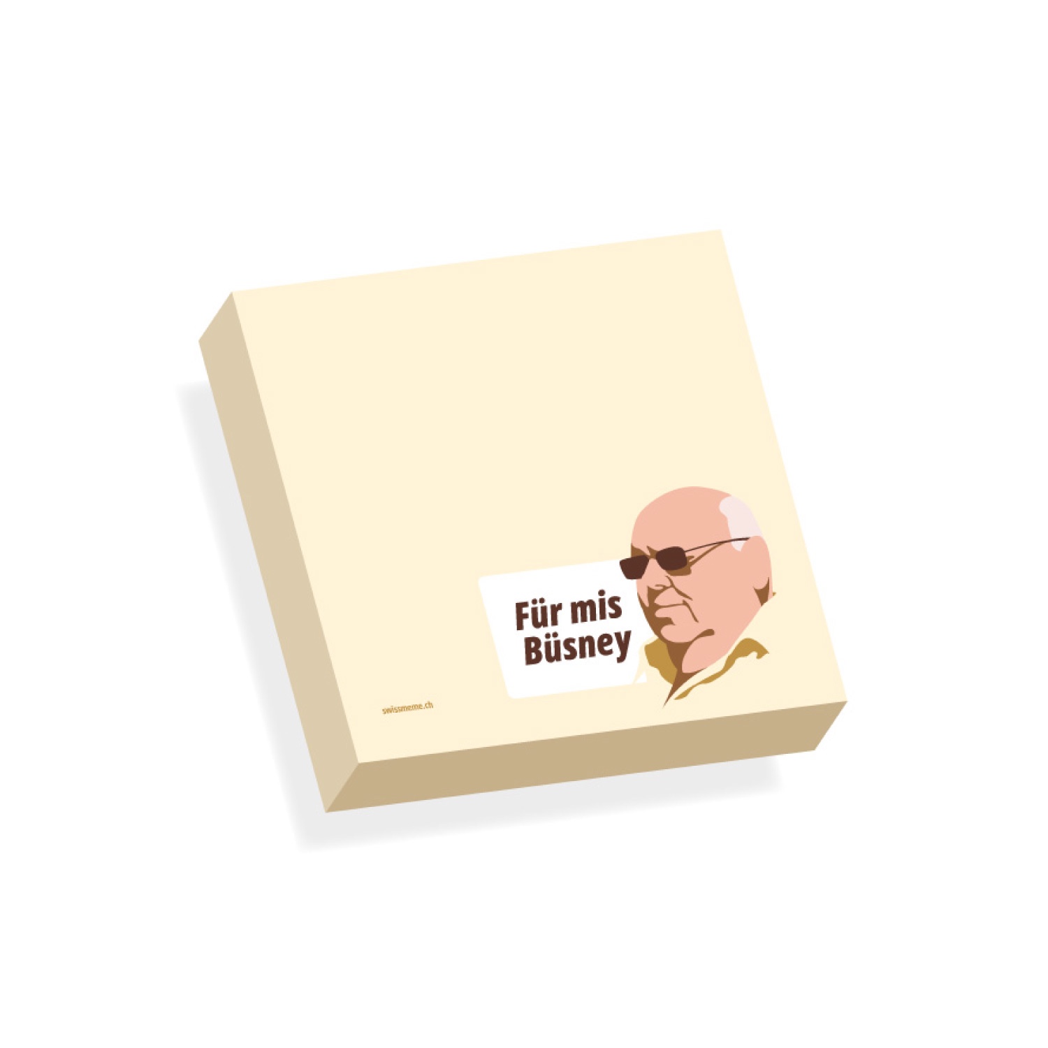 Haftnotizen Büsney mit dem Text: „Für mis Büsney“ mit Josef Jakob Meme. Der Notizzettel haften auf fast allen Untergründen und sind leicht wieder zu entfernen. – Grösse: 7,0 x 7,0 cm (50 Blatt)- Gewicht: 20 g- Material: Haftpapier