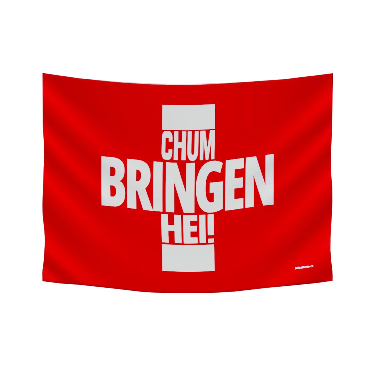 Grosse Fan Flagge mit Schweizerkreuz in dem der bekannte Liedtext von Bashi steht: CHUM BRINGEN HEI! Passend zu verschiedenen Anlässen wie EM oder WM usw. Schweizer Fan Artikel der besonderen Art in langlebiger hochwertiger Qualität. . Grösse: 100 x 75 cmGewicht: 60 gMaterial: Polyester, Kunststoff